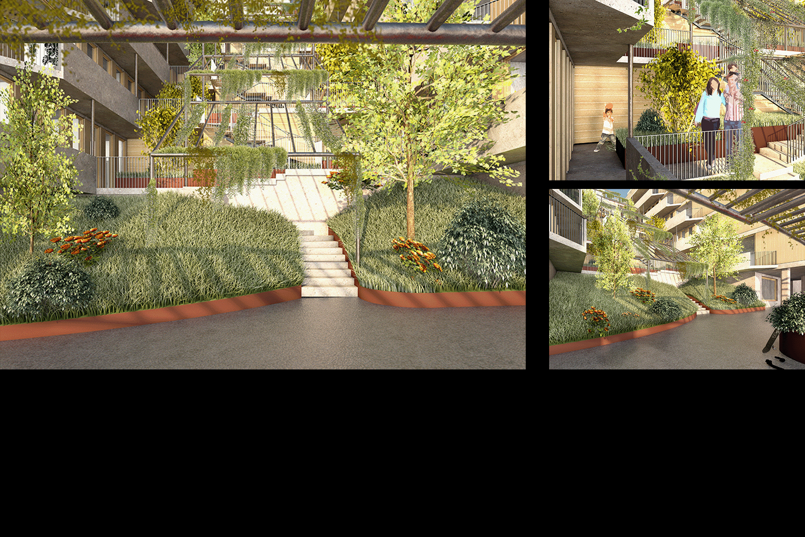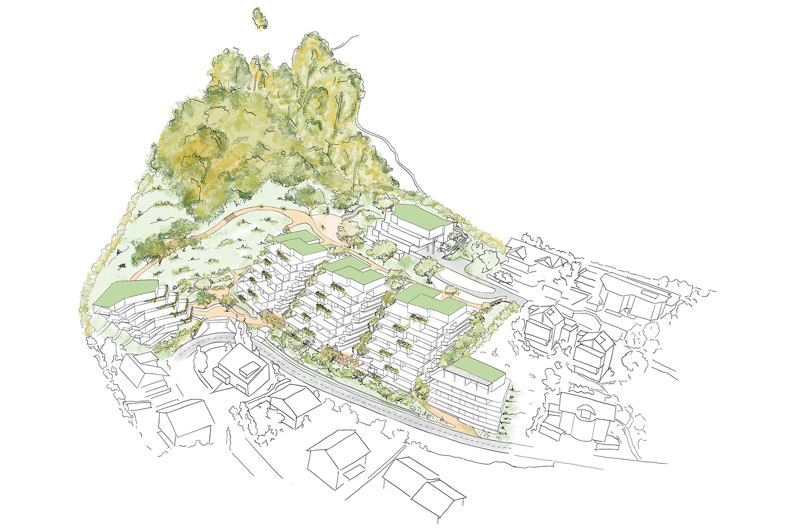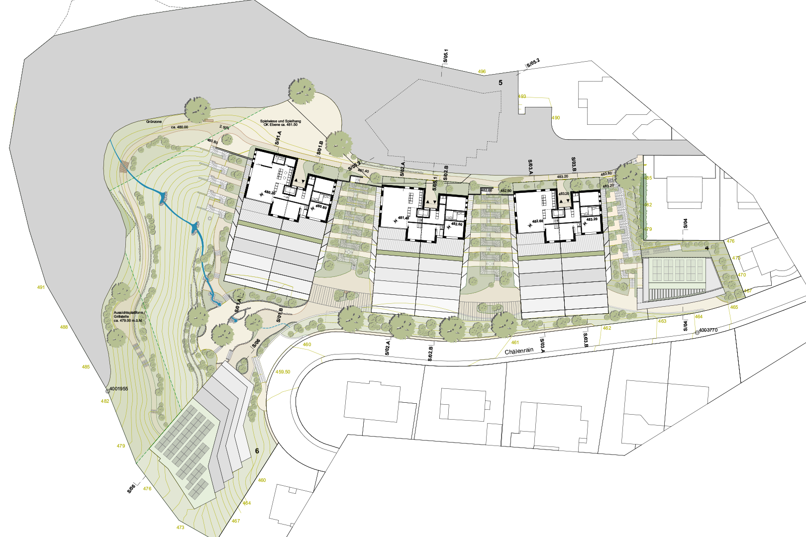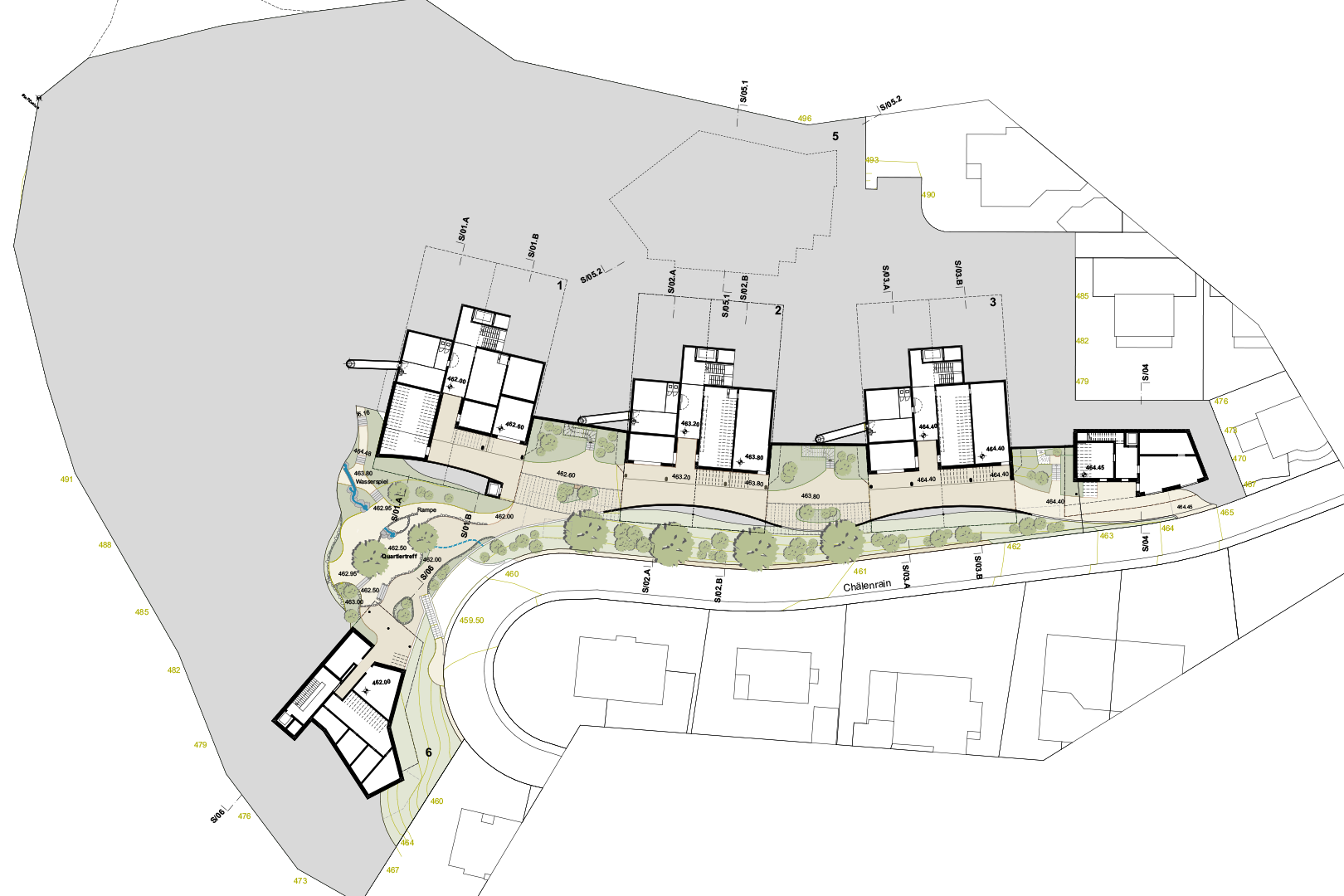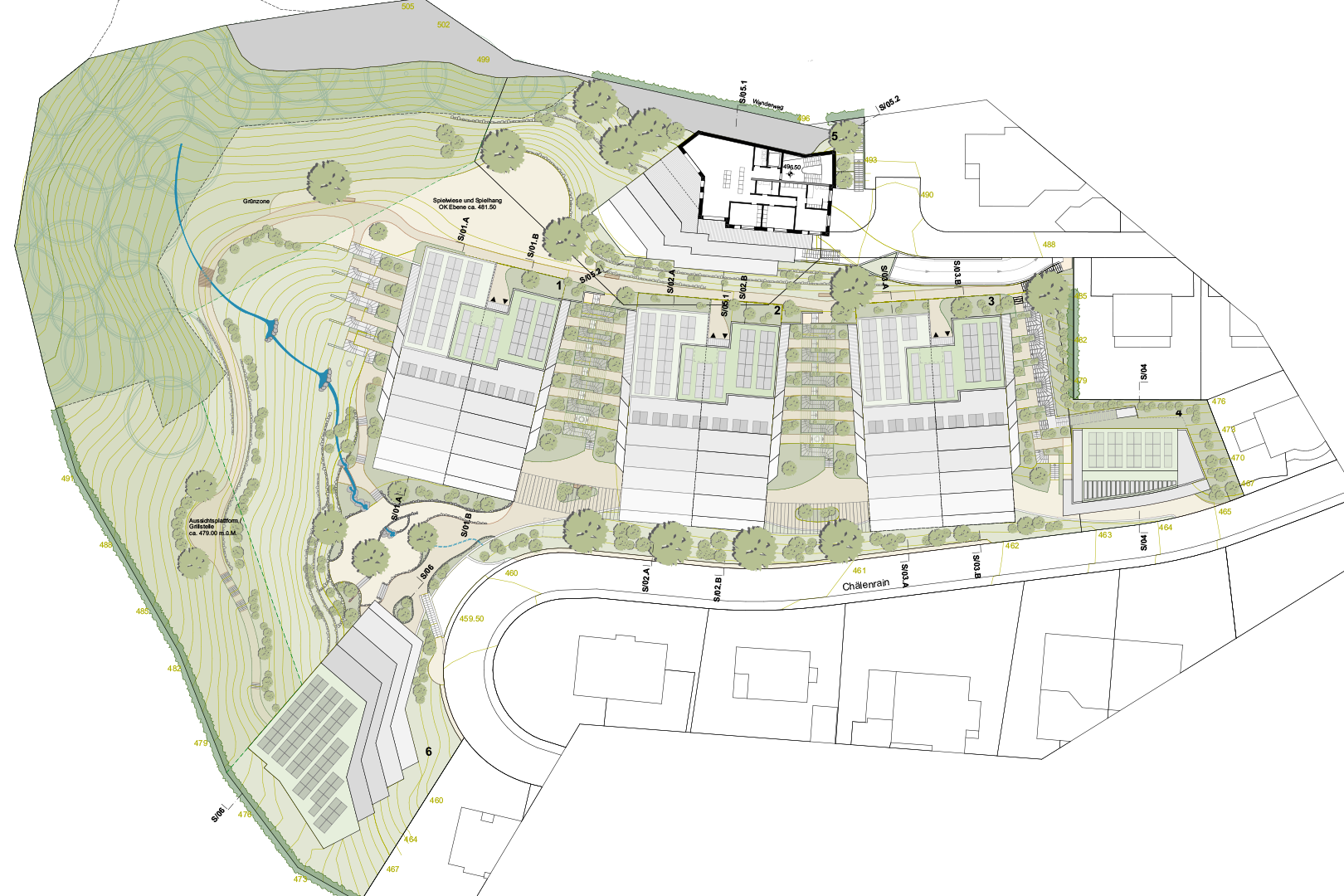 Die gesamte Anlage ist geprägt durch 4 Gebäudetypen, die sowohl topografisch als auch besonnungsmässig optimiert in das anspruchsvolle Gelände eingefügt werden. Das ganze Areal ist autofrei. Die Garagierung für den motorisierten- und den Langsamverkehr ist in Einstellhallen unter Terrain angelegt. Die Überbauung ist über Wege und Treppen für Anwohnende und Besuchende frei zugänglich und für die Bewohnenden zusätzlich über zentrale Liftanlagen erschlossen.
