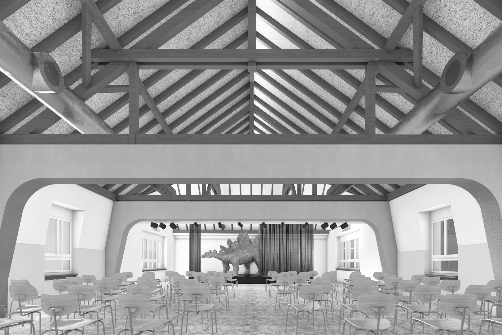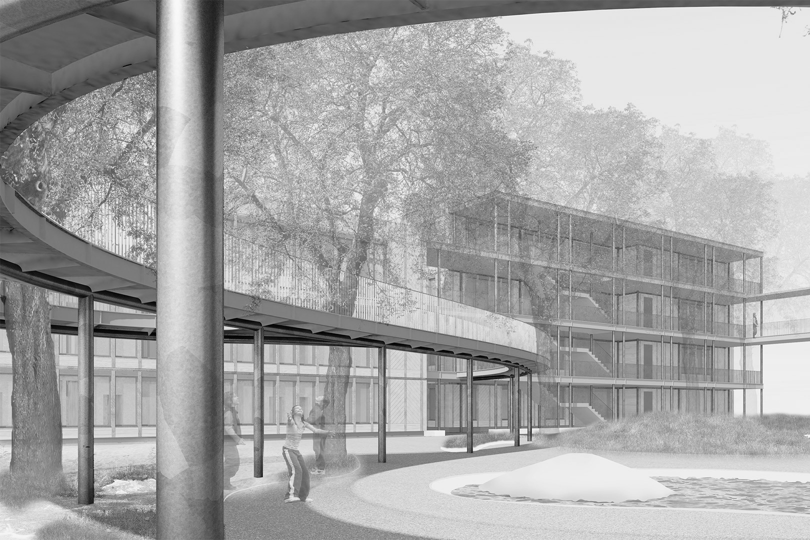 Die Neubauten sind organisatorisch über den Laubengang miteinander verbunden, haben aber im Grundriss ihre ganz eigene Logik. Der westliche Bau hat im Inneren einen grosszügigen Korridor und ungerichtete, windradartig angeordnete Räume. Das östlich gelegene Gebäude wiederum ist ganz auf den südlichen Aussenraum ausgerichtet und hat eine klare Dreiteilung. Beide Bauten sind komplett in Holz konzipiert. Die meisten Bauteile können vorfabriziert werden, sodass mit einer kurzen Bauzeit gerechnet werden kann.